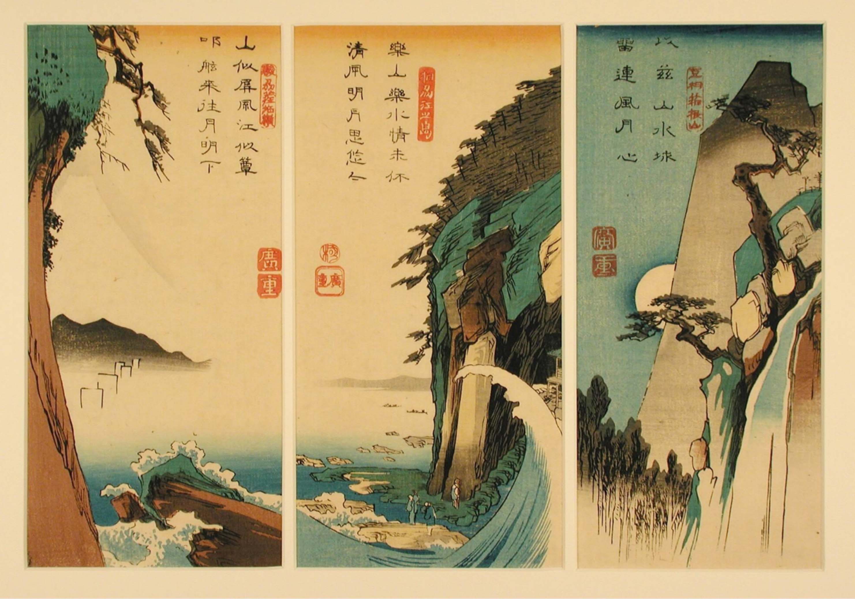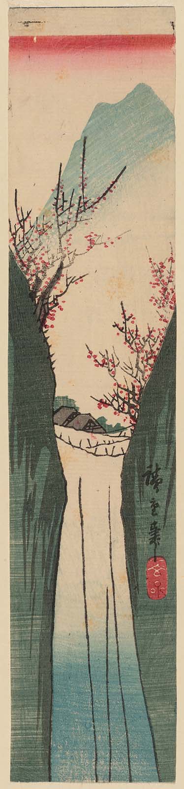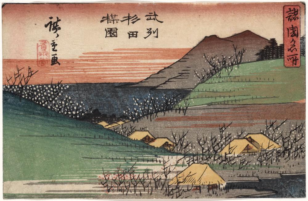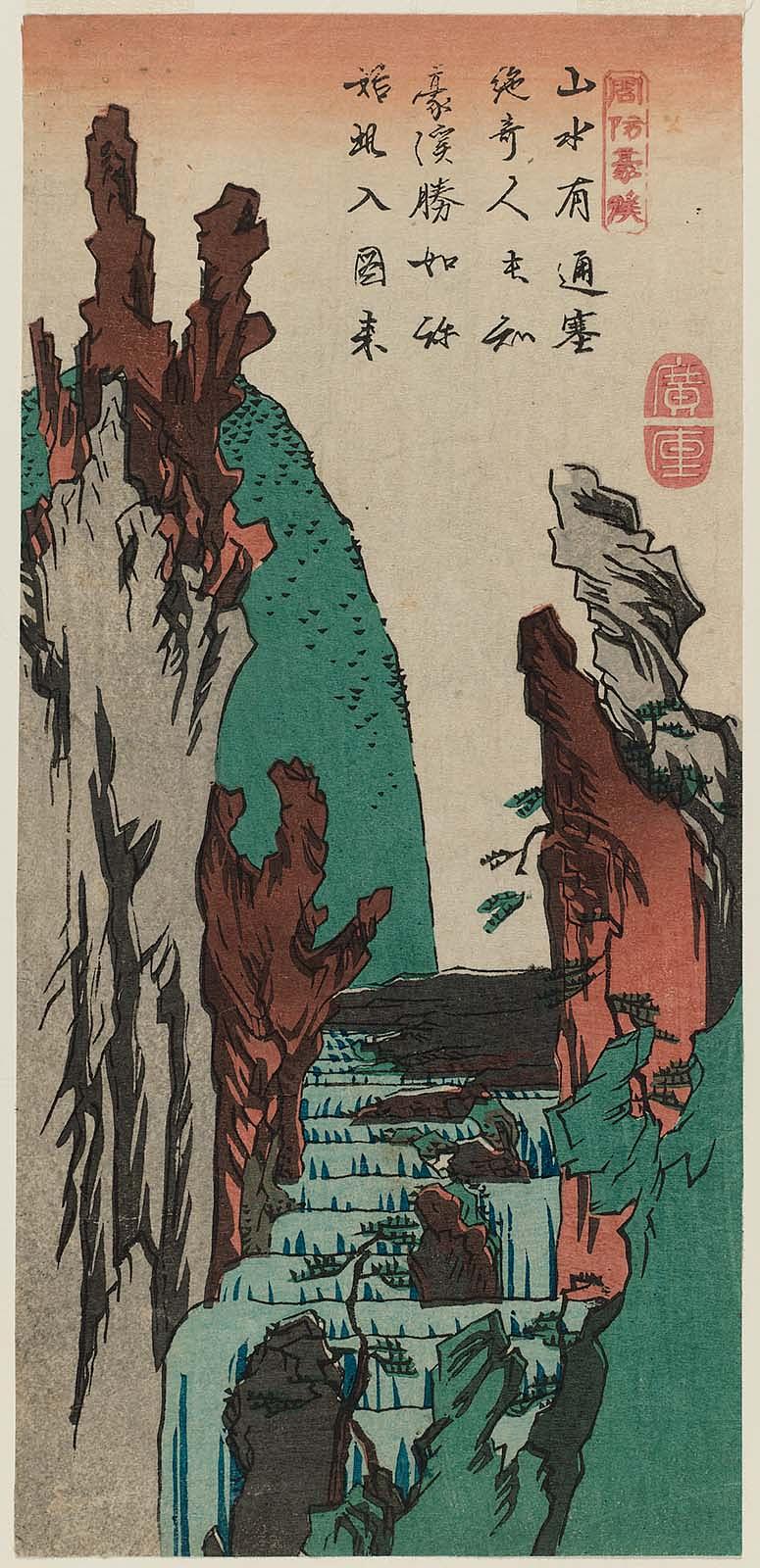 Harimaze sheet with four landscapes: Harbor with Boats (top right), Plum Garden at Sugita (bottom right), Monkey Bridge (center left), Waterfall (left)