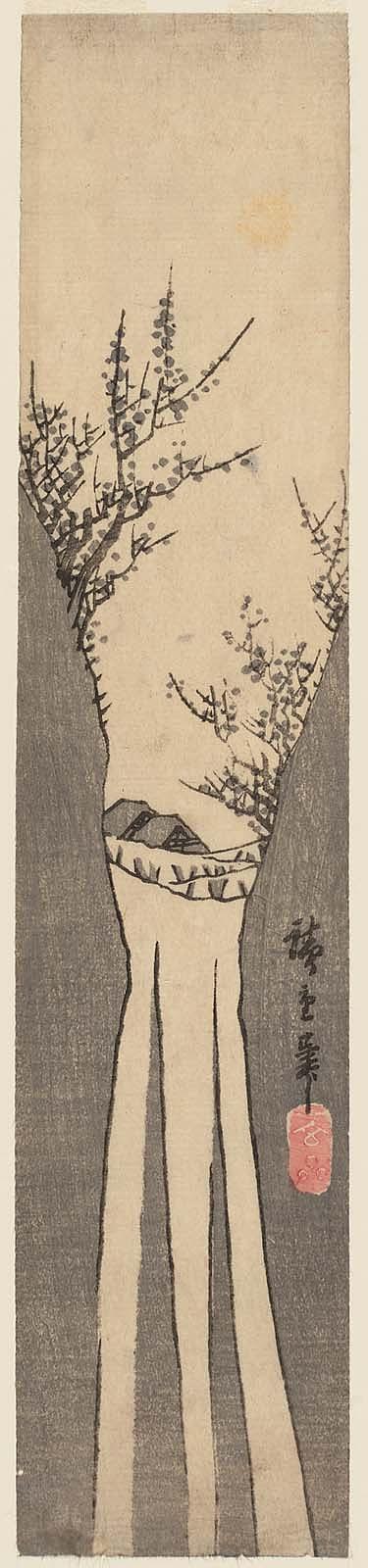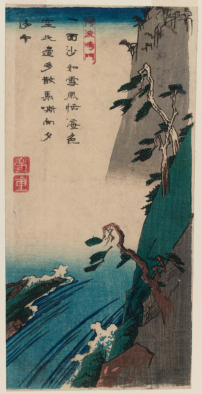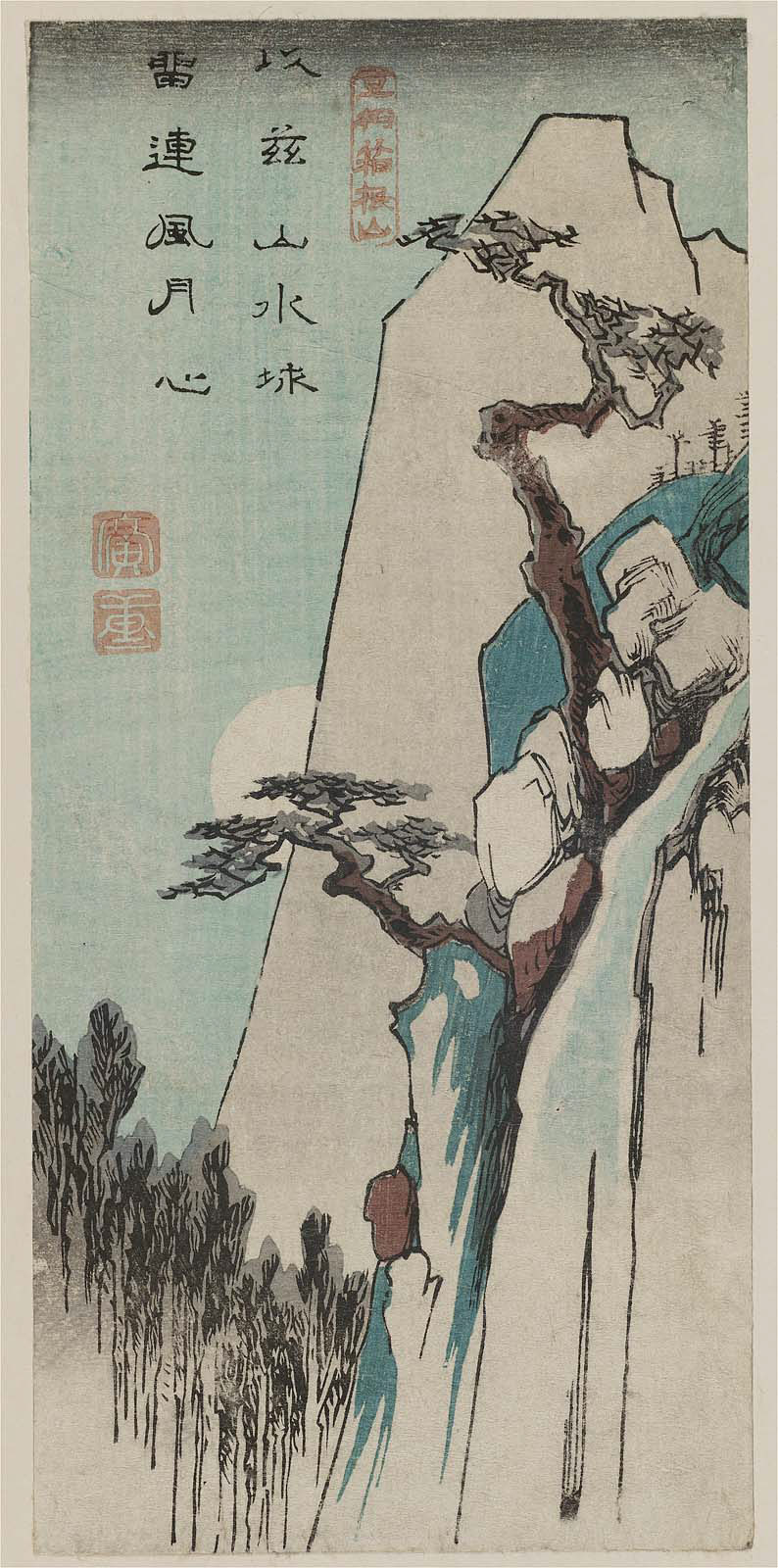 Harimaze sheet with four landscapes: Harbor with Boats (top right), Plum Garden at Sugita (bottom right), Monkey Bridge (center left), Waterfall (left)