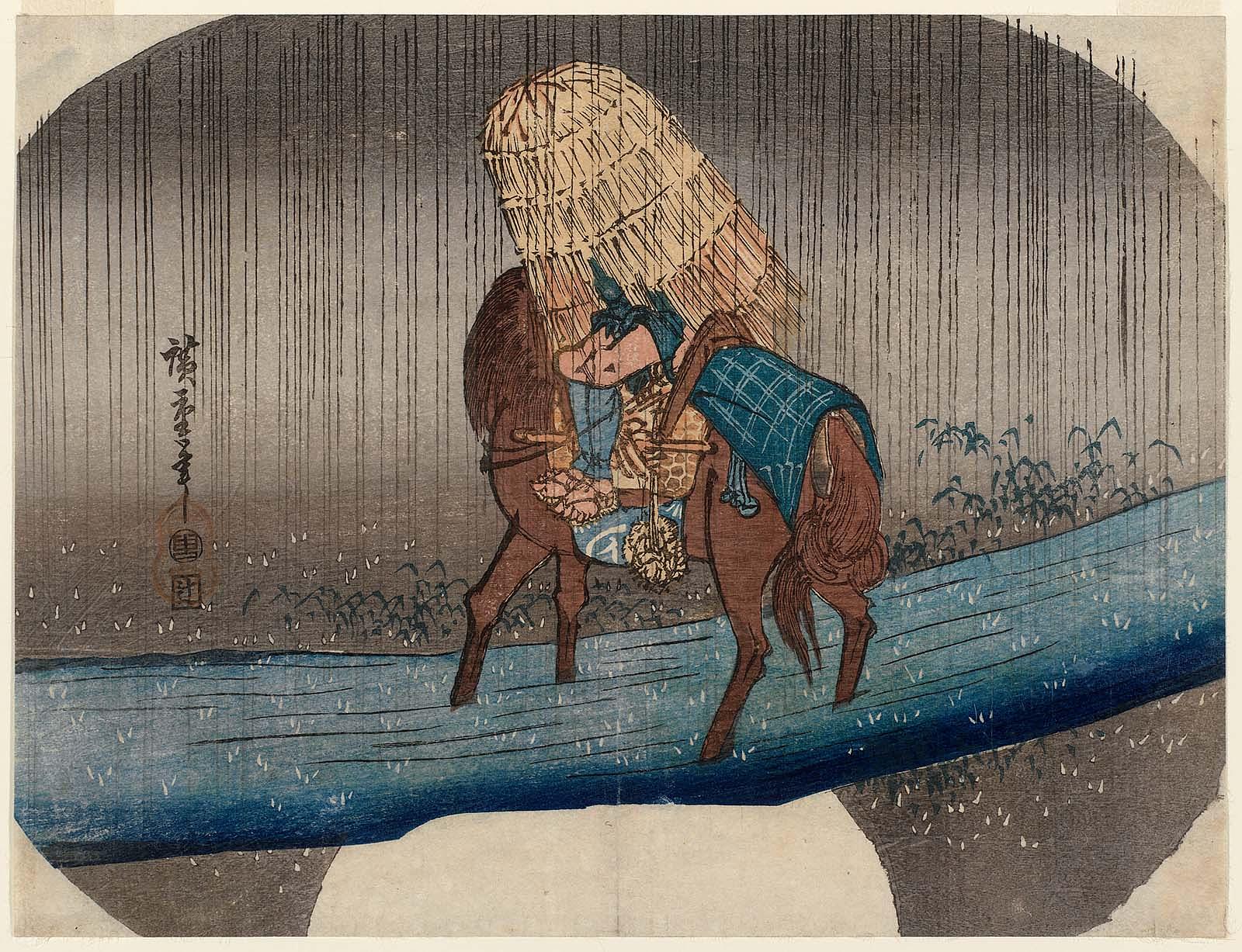 Man on Horseback Fording a Stream in Rain