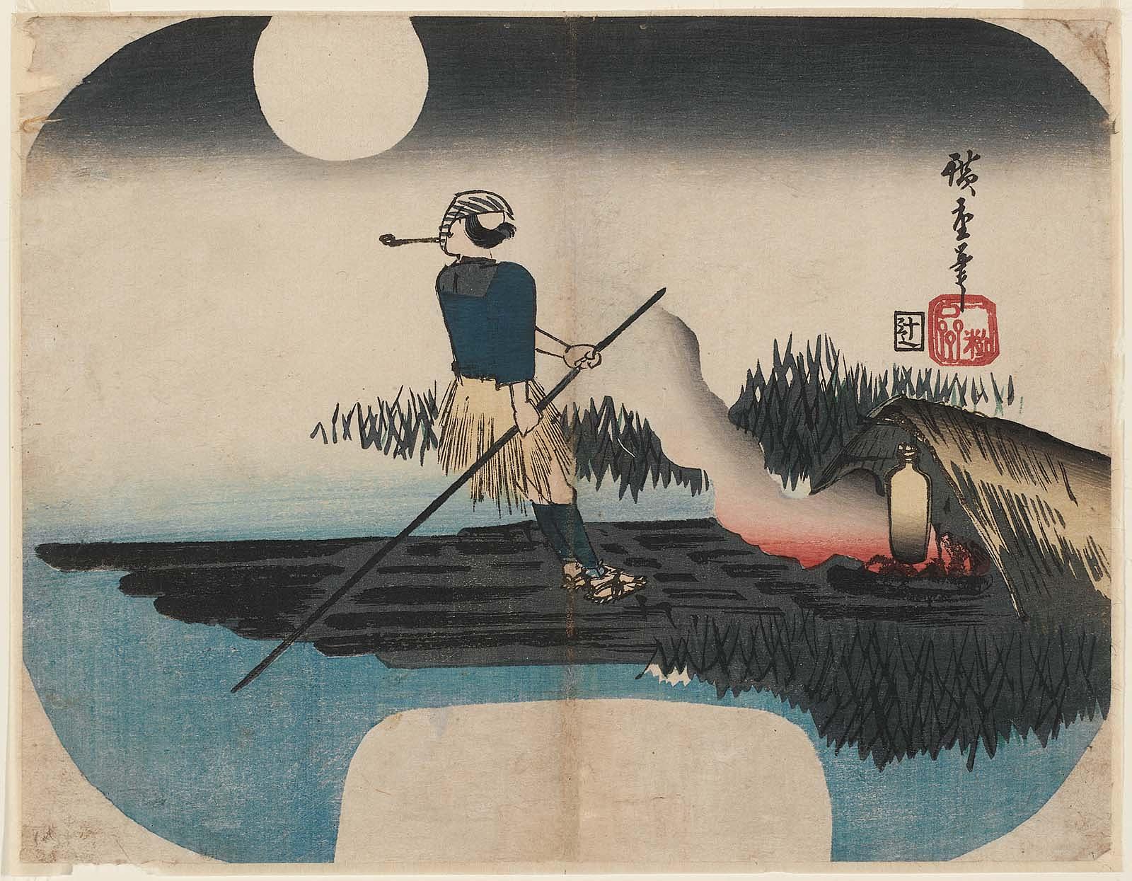 Man Poling a Raft on a Moonlit Night