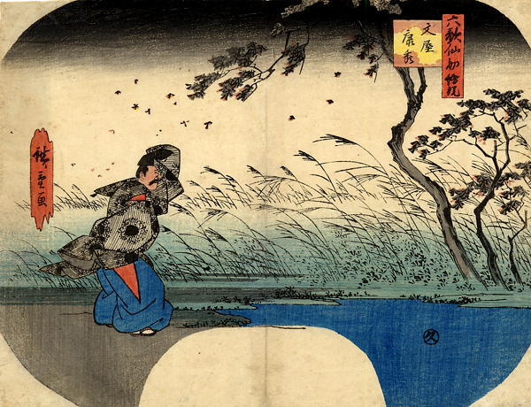 Bunya Yasuhide, one of the Rokkasen (the six most important poets in Japan) struggling in the Autumn wind with falling Maple leaves.